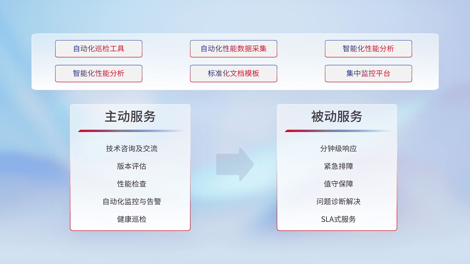 智能化工具和标准化文档,,保障服务质量,,,,提供主动服务(包含技术咨询、、版本评估、、、、性能检查、、自动化监控与告警、、健康巡检)和被动服务包含(分钟级响应、、、、紧急排障、、、、值守保障、、问题诊断解决、、SLA服务)。。。。